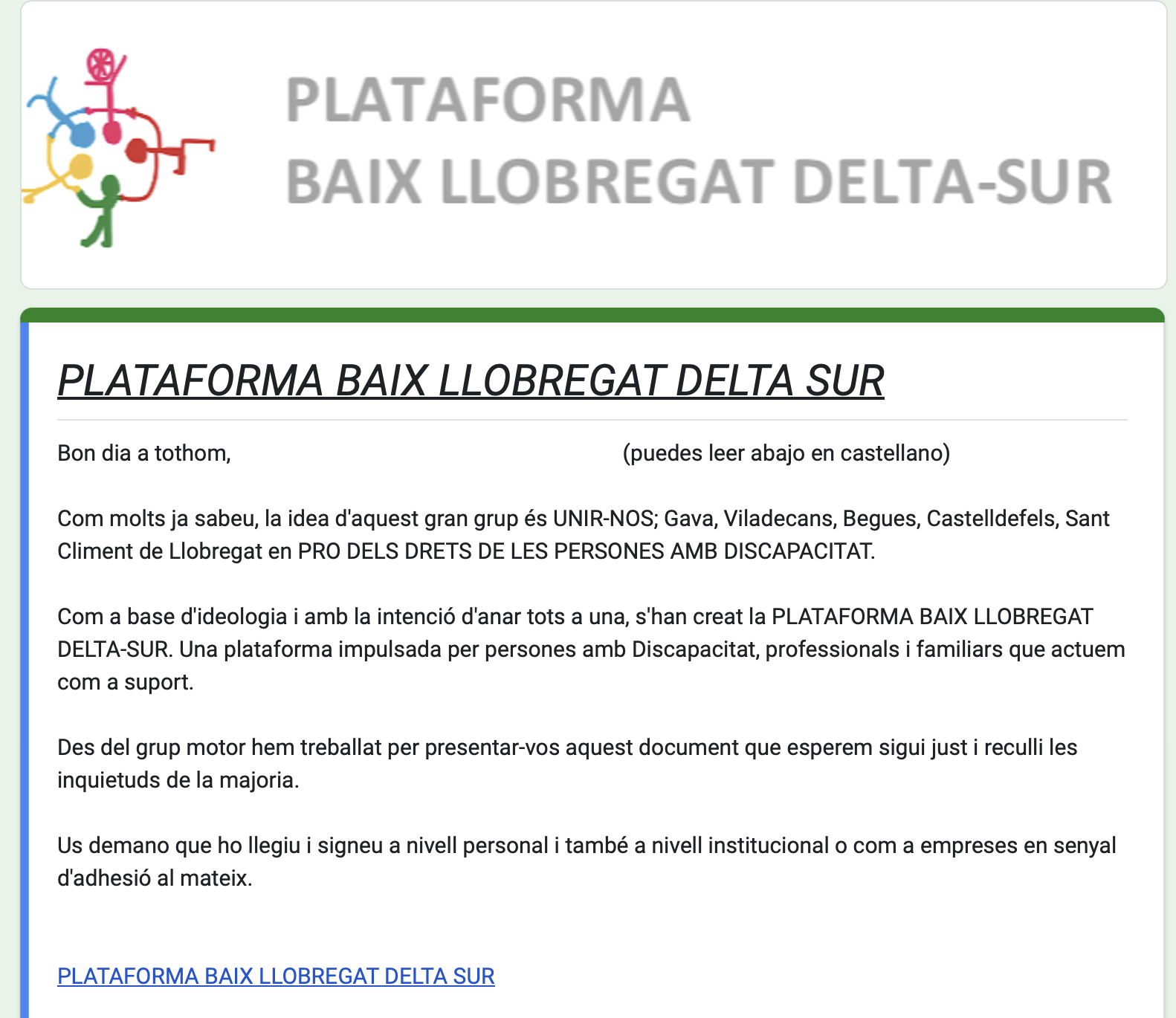 A día de hoy los principios están respaldados por unas 100 familias de Gava, Viladecans, Sant Climent, Begues y Castelldefels.